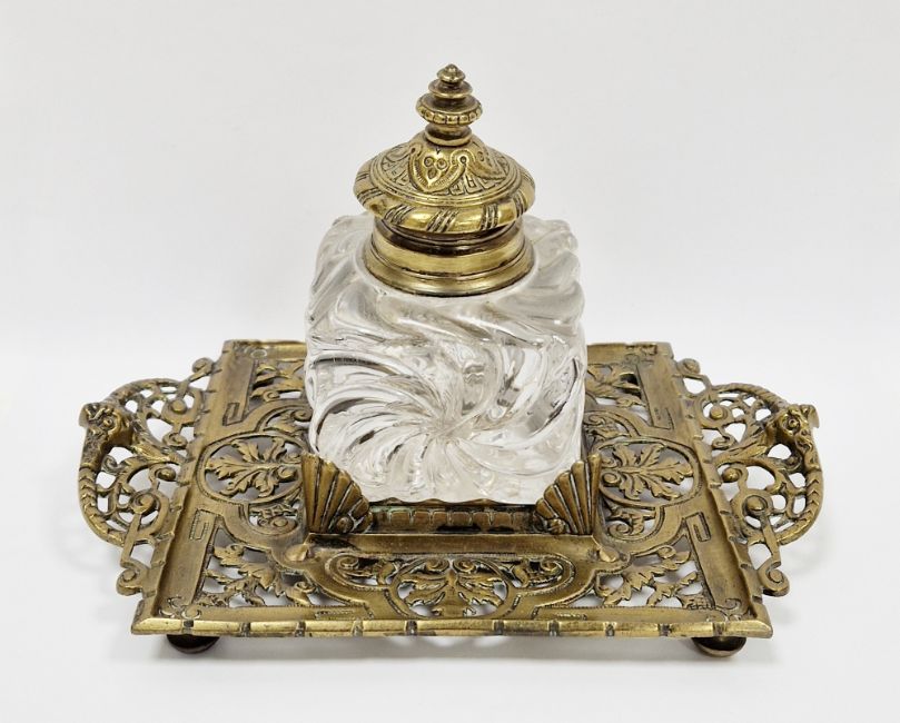 Victorian inkwell on stand, the square moulded swirl glass inkwell with brass hinged lid, fitted on a pierced brass twin handled stand, etched Townsend & Co to base, 15cm high x 22cm wide