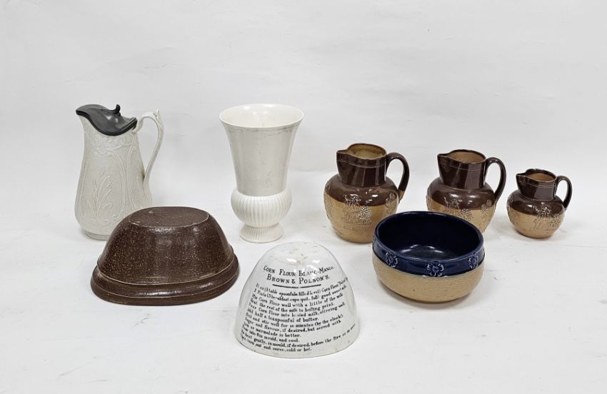 Collection of English pottery and stoneware, late 19th to early 20th century, including a set of three graduated Doulton Lambeth stoneware harvest jugs, a bowl moulded with bark-pattern with blue glazed foliate border, a Brown & Polsons pottery jelly mould printed in black with a recipe for cornflower blancmange, 15cm wide, a brown salt glazed stoneware jelly mould with a recumbent lion, a Victorian pewter-mounted white stoneware relief- moulded jug, with grasses and a Wedgwood white glazed flared flower vase with gadrooned base, 20th century printed marks