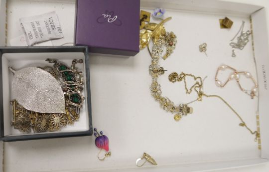 Marcasite brooch, foliate pattern, a silver banglesundry gilt metal jewellery and other items (1 tray)