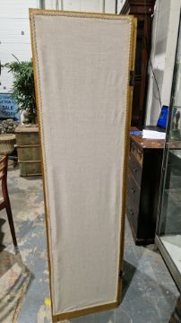 Gilt framed folding three-panel dressing screen, the rounded arched central panel with four-mirrored section, the two end panels with printed images of classical figures, all above floral upholstered panel, 159cm high x 128cm wide Property of Dunkirk Manor, Theescombe, Stroud Condition Report Surface scratches, and scuffs. Wear to gilt in numerous places. Joint at base of one screen slightly separated. General wear and tear
