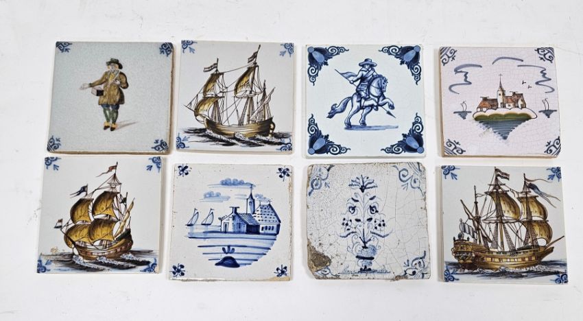 Collection of eight Dutch Delft polychrome and blue and white tiles including an 18th century example painted with a jardiniere of flowers within scroll border, 13cm square, the remainder 20th century, including: three painted with galleons, one with an equestrian figure, a landscape and another with a the figure of a man, possibly a street seller, all with scroll borders (8)