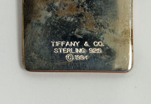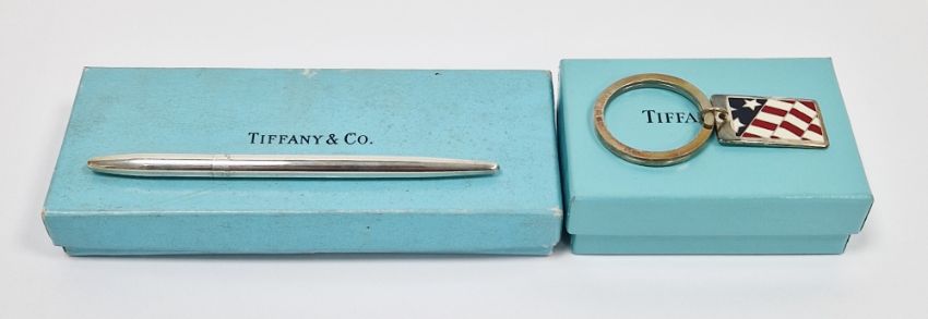 Tiffany sterling silver key ring, the enamelled fob decorated with part of the USA stars and stripes flag, together with Tiffany sterling silver ballpoint pen, of plain form with cap, both stamped Tiffany & Co with original cloth retail bags and boxes