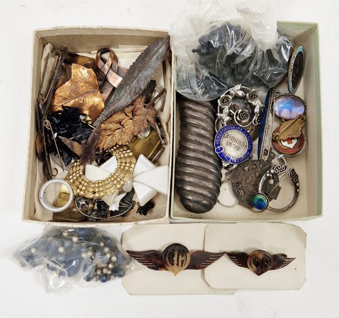 Collection of jewellery including two silver brooches set with butterfly wings, silver and enamel ' Herefordshire Central Hospital ' badge, other medical related badges, Celtic penannular brooch set with an iridescent cabochon together with other costume jewellery including brooches, beaded rings, etc