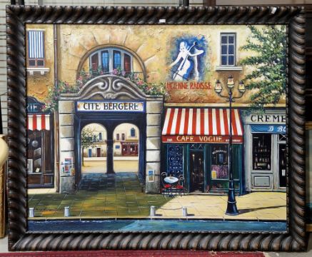Miroslav Lovric (Bosnia, 1955) Oil on canvas "Cafe Vogue" Large Parisian street scene with shop exteriors, signed lower right, framed, 122cm x 152cm Condition Report Dimensions are correct. Dimensions including frame - 141cm x 172cm