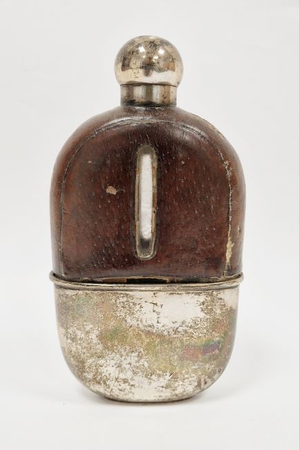 Victorian silver and glass hip flask, with partial leather cover and detachable silver cup, London 1886, maker's mark rubbed, screw top lid not hallmarked, 16cm high, silver cup weighs 2.31ozt