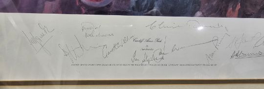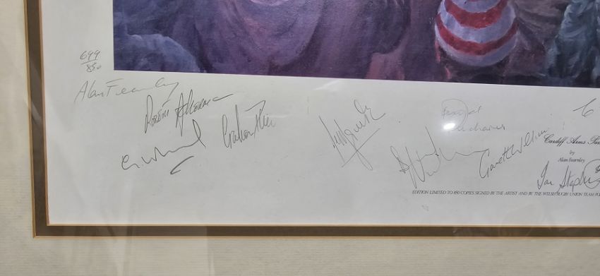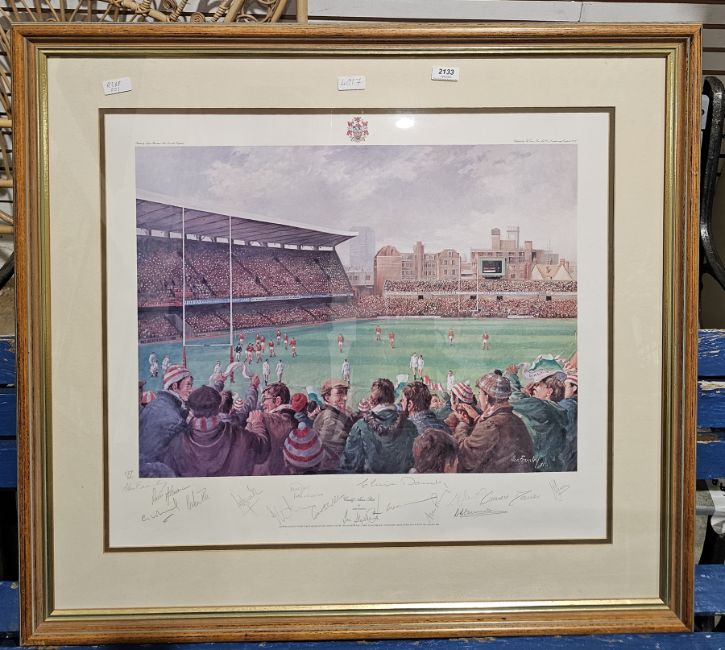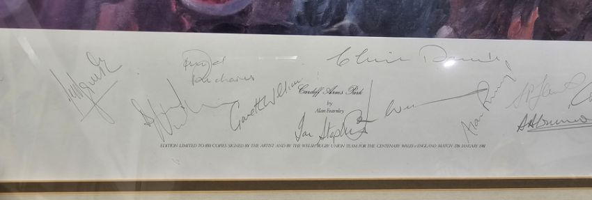 "Cardiff Arms Park", limited edition print 699/850, signed by the artist and the Welsh Rugby Union team for the centenary Wales vs England 1981, framed and glazed, mount aperture 56.5cm x 65.5cm