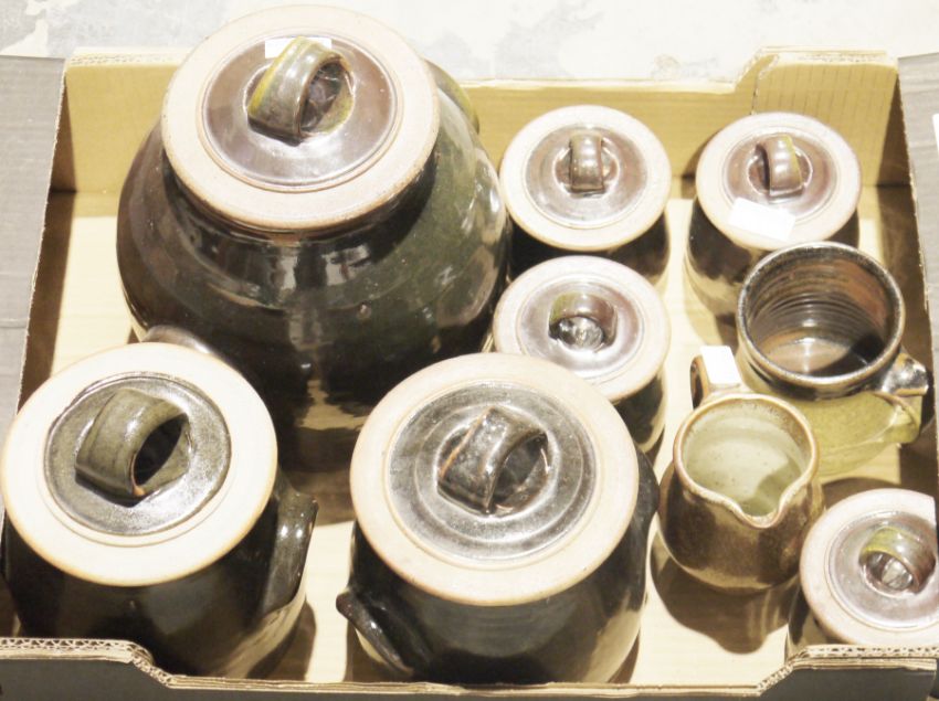 Set of seven studio pottery brown glazed lidded storage jars, largest 26cm high together with a similar jug and mug