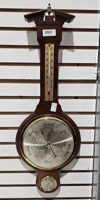 20th century Cleevedon Weathermaster brass-mounted barometer, in stained oak case, 58cm high
