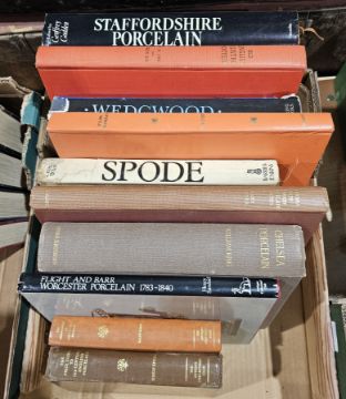 Collecting Porcelain and china, reference books - William, King " Chelsea Porcelain", Rissik Marshal " Coloured Worcester Porcelain", Hurlbutt " Bow Porcelain",  W.G. John " William Billingsley 1758-1788" , Henry Sandon " Flight and Barr Worcester Porcelain 1783-1840" , Leonard Whiter " Spode", W, D John and Warren Blake " Old English Lustre Pottery", Frank Stoner " Chelsea , Bow and Derby Porcelain Figures"  and other related volumes ( 1 box)