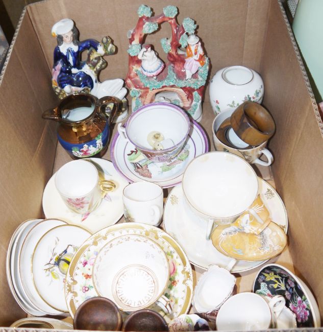 Pair of Derbyshire framing cream coloured box frames and Chinese prints, one showing girls picking tea, the other men hoeing the ground, both framed and glazed  and a collection of predominantly ceramic items to include 19th century and later cups and saucers, two Staffordshire flatbacks etc