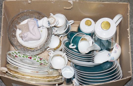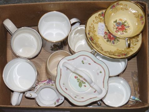 Quantity of ceramics to include a Nao figure of a seated girl with puppy, an Aynsley yellow ground gilt and floral decorated cup and saucer, a Wedgwood Wild Strawberry pattern handled basket and other items (2 boxes)