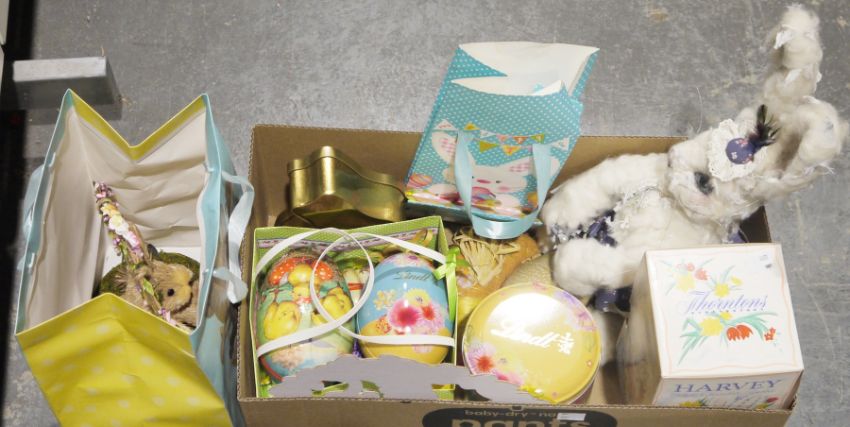 Small quantity of Ameliaranne childrens books, a Villeroy & Boch Peter Rabbit Bunnytales eggcup in box, a Royal Doulton two hearts entwined toasting hoops, a small quantity of Easter decorations and other items (2 boxes plus)