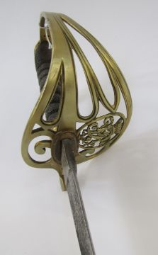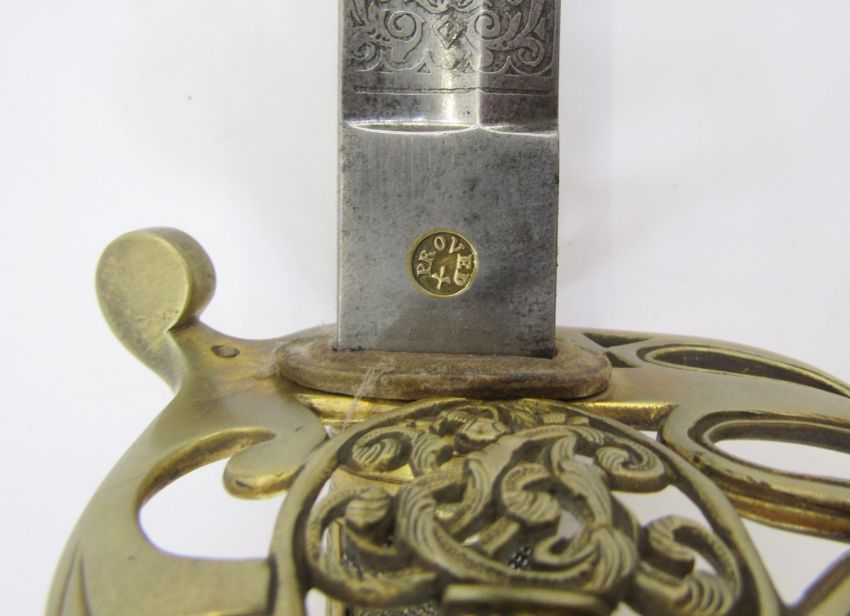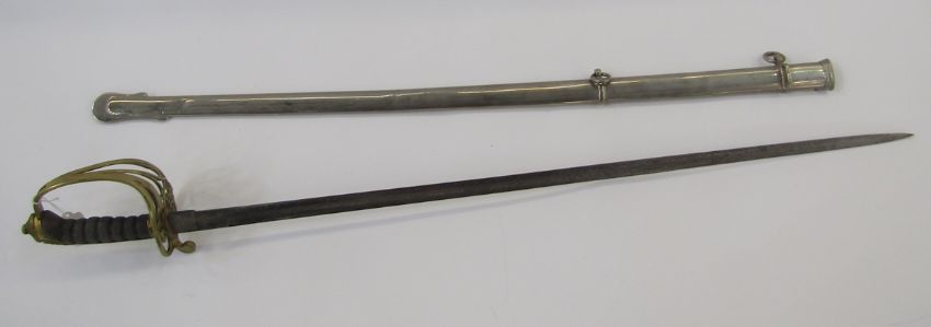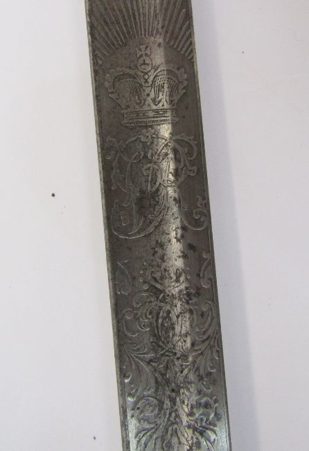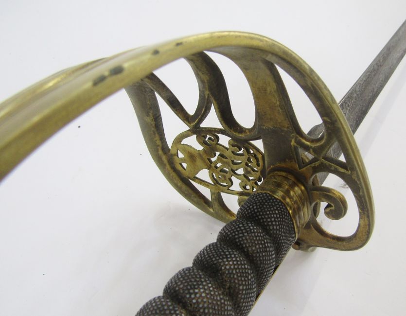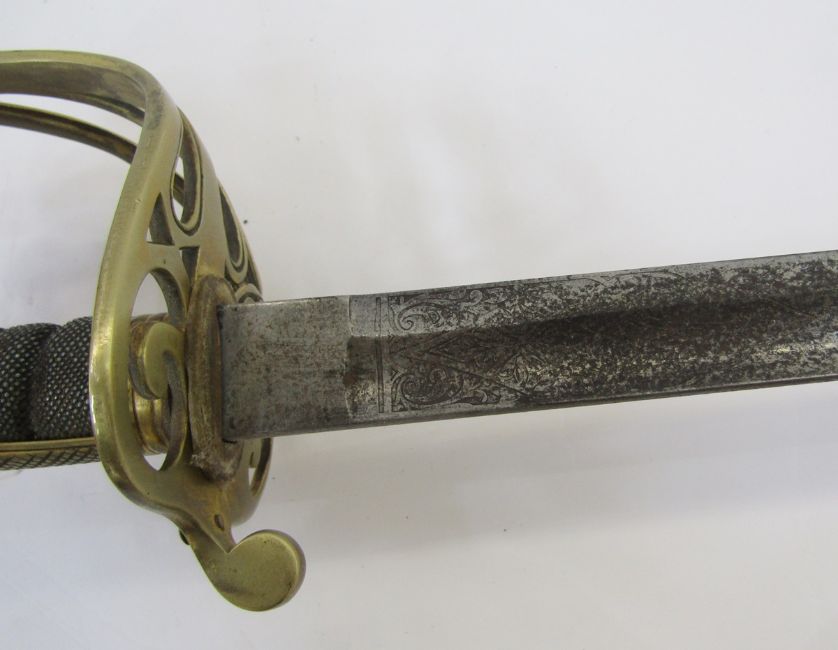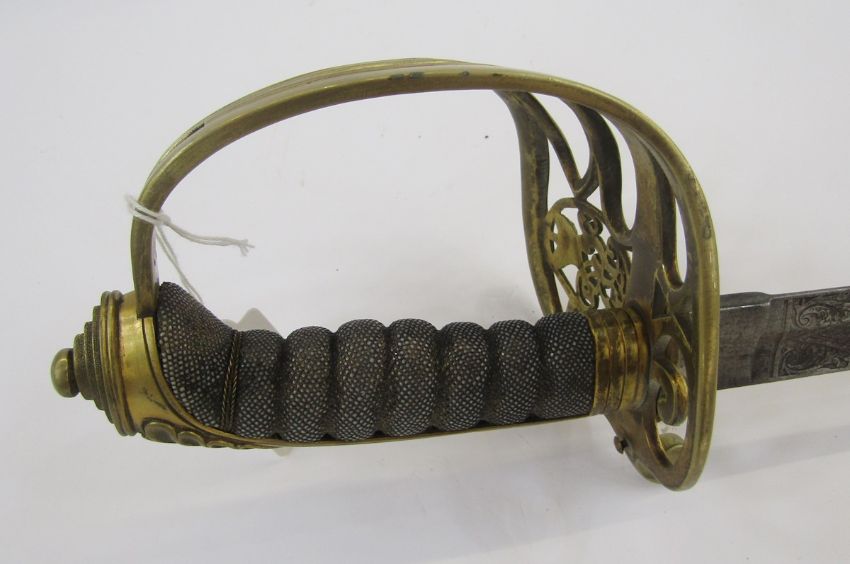 Victorian officer's dress sword with brass guard, fish skin grip, engraved blade and plated scabbard