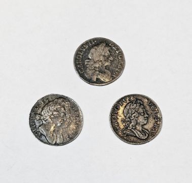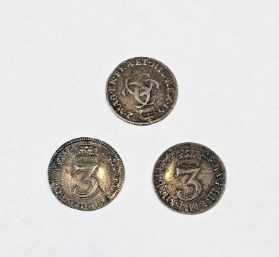 Group of 3 early milled threepences, Charles II 1682 fine, William and Mary 'GV' below bust 1692 very fine, George I 1723 very fine (please note VAT will be payable on the hammer for this lot)