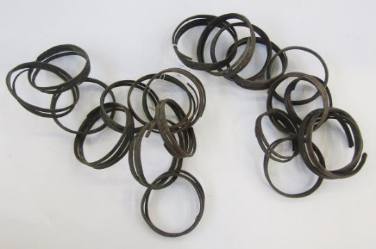 Two chains of bronze currency bangles/ringlets, possibly from the Democratic Republic of Congo, one chain having 11 rings, the other 10 rings