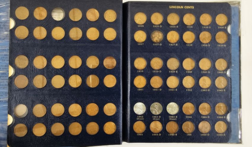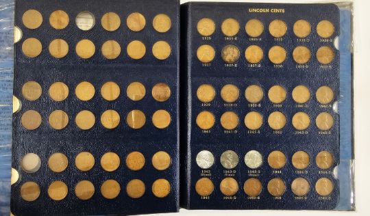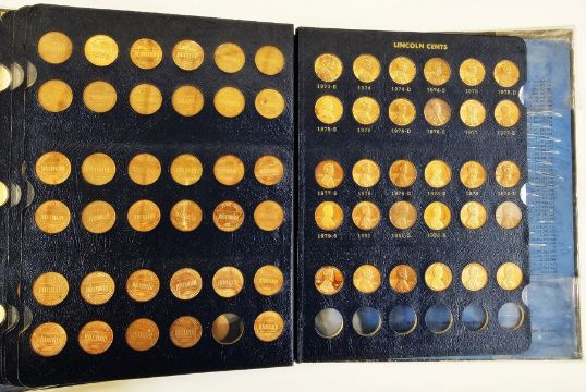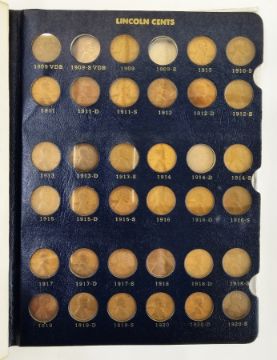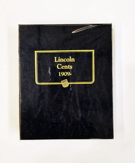 Whitman Folder of Lincoln Cents, Lincoln facing right, date by chest, rev. one cent within wreath, from 1909-1983, please note following missing: 1909 S VDB, 1909S, 1914D, 1922 (no mint mark), 1931S, 1955 Double Die