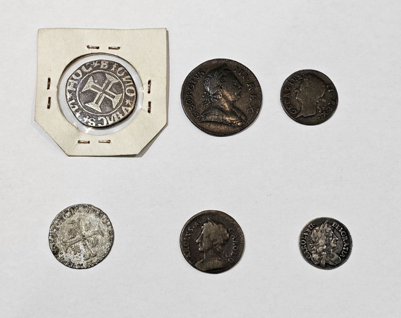 Group of coins (6), George III halfpenny good fine, George II 1744 Irish farthing, Charles II farthing, Charles II 1683 threepence, together with Portugal Manuel I (1495-1521) Tostao, and Henry III Douzain Aux Deux 3e type (please note VAT will be payable on the hammer for this lot)