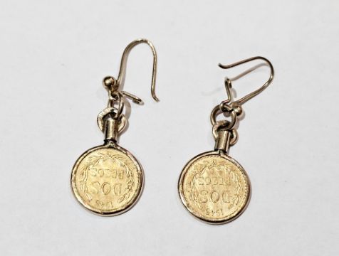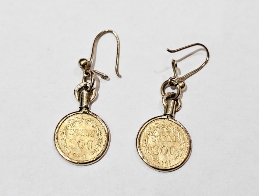Pair of Mexican two Dos Pesos gold coins dated 1945, adapted into earrings, the earring mounts indistinctly stamped 14ct, gross weight 5.2g approx.