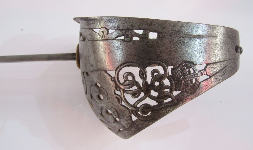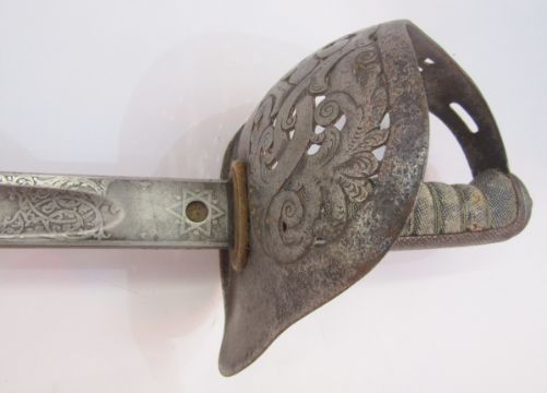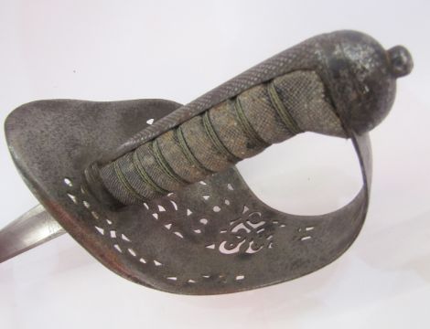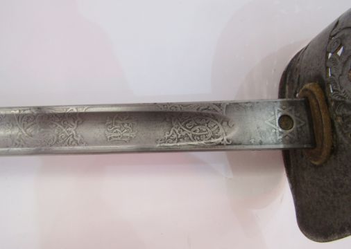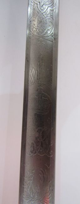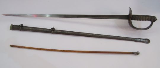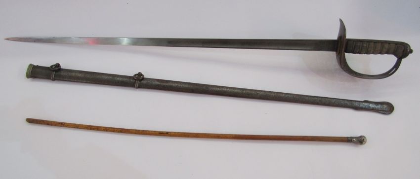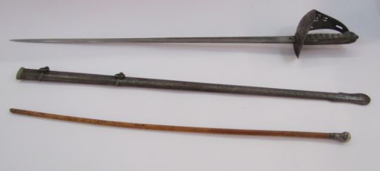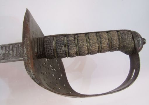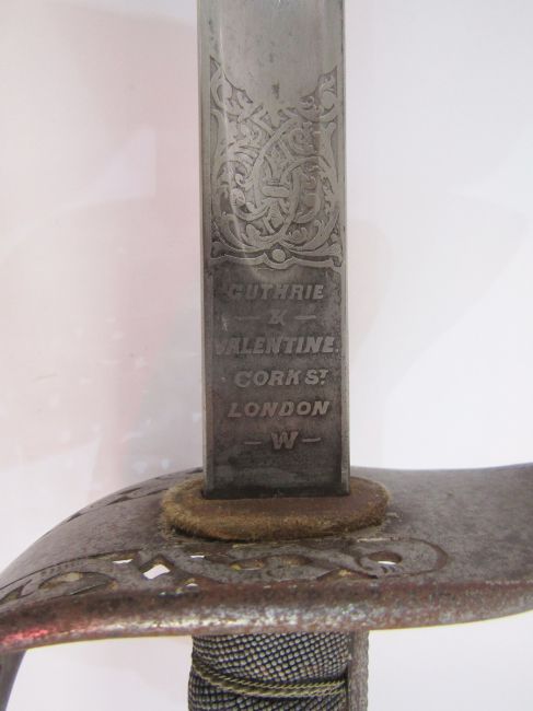 Edward VII officer's dress sword and scabbard made by Guthrie and Valentine of Cork Street, London, scabbard 85.5cm long approx, the blade 82cm long approx, together with a silver-topped swagger stick, hallmarked London 1906 Condition Report The scabbard does not have any dents I can see, just general wear. The blade and scabbard do not appear to be bent out of shape. The pommel does not jiggle.