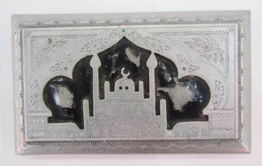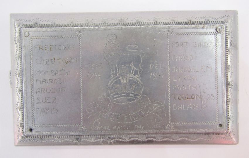 WWII trench art cigarette case with Indian engraved decoration, back engraved Royal Army Pay Corps and dated September 1944-December 1947