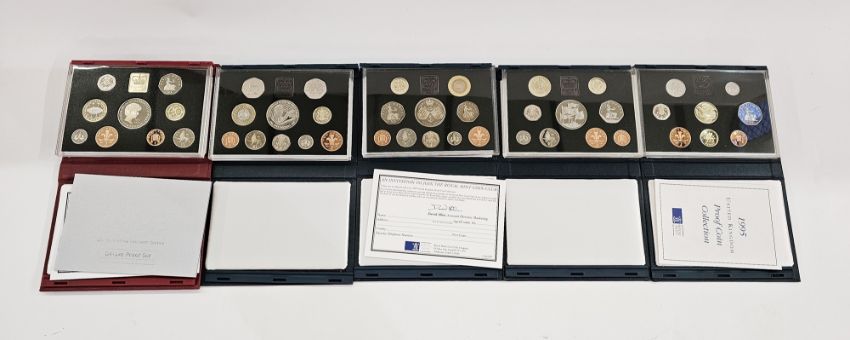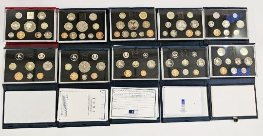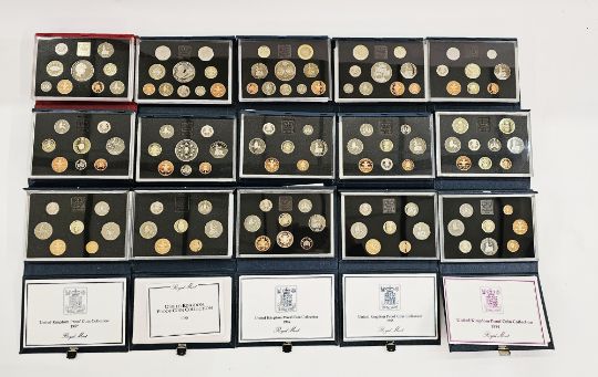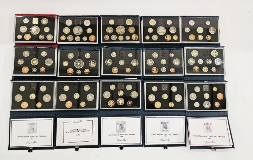GB coins: Box of 15 Royal Mint QEII decimal proof coin sets 1984-1999, including 1989 Scottish Claim of Right and 1999 Diana commemorative in higher value red pack. Spink cat £450+.