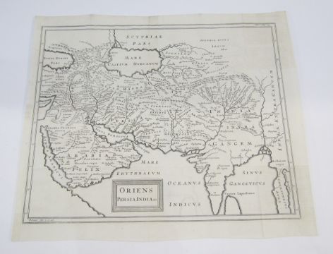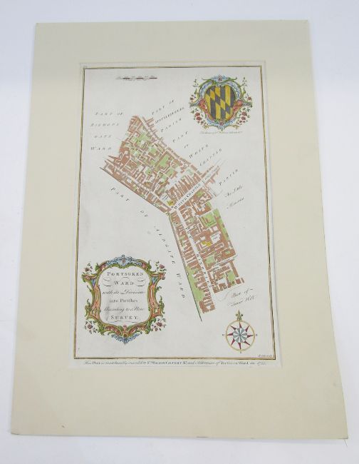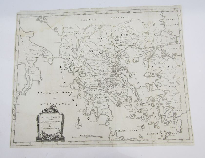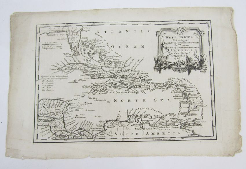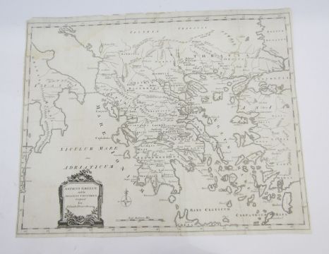 Three 18th century black and white engraved maps including ‘The West Indies exhibiting the English, French, Spanish, Dutch & Danish settlements … 1768‘, 23.5cm x 36cm, ‘Oriens Persia, India ..’, 34.5cm x 41cm, ‘ Ancient Greece and the adjacent countries designed for Lelands Demosthenes', 40.5cm x 50cm, together with 18th century coloured plan engraving of Portsoken ward with its division into parishes according to new Surrey, 37cm x 24cm (4)