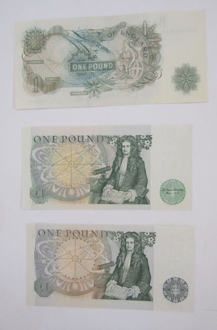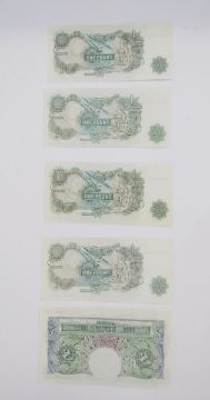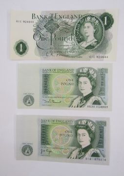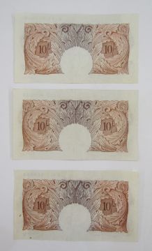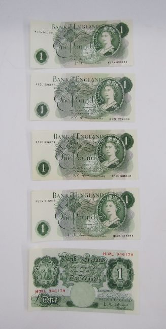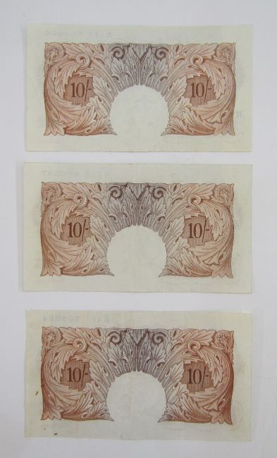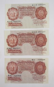 3 x Bank of England 10 shilling notes, (1) signed K O Peppiatt (October 1934), prefix B41 708884, (BE22c), (1) signed P S Beale, (March 1950), prefix U 29 Z 690537, (BE30c (1) signed L K O'Brien (November 1955), prefix K11Y 968066, all generally fine, 5 x Bank of England one pound notes, (1) signed L K O'Brien, prefix H32L 946179 (BE56i), (1) signed J Q Hollom, prefix H52S 318948, (BE64c), (2) signed J S Fforde, prefix R62L 226686 & R 31K 636631 (BE72c), (1) signed J B Page, prefix W77A 030144 (BE72c), 3 x Bank of England one pound notes, (1) signed J B Page, prefix D12 675370 (BE83c), (1) signed D H F Somerset, prefix AS21 154965 (BE87c), (1) signed L K O'Brien, prefix 61E 924644 (BE61c), group extremely fine (x3) (10 notes)