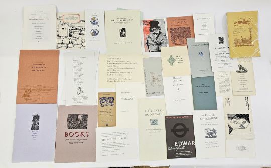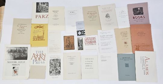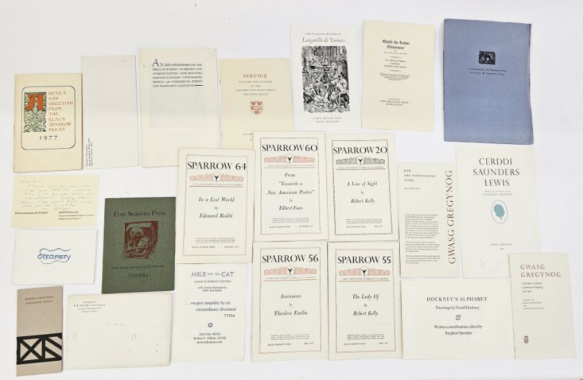 Private Press, Typography, Printing -  50+ assorted Private Press prospectuses, announcements, printed booklets and other items of ephemera etc, including 'Books coming from The Whittington Press.....' Libanus Press, Incline Press, The Rocket Press, Gwasg Gregynog Press, The Lakeside Press, Pennyroyal Press, The Ashdene Press, Little Gidding Press, The Celtic Cross Press, The Reading Room Press, Black Pennell Press, Fine Pres Book Fair leaflet October 1990, Hanborough Parrots, Shoulder Press, The Stourton Press etc. (collection) two folders