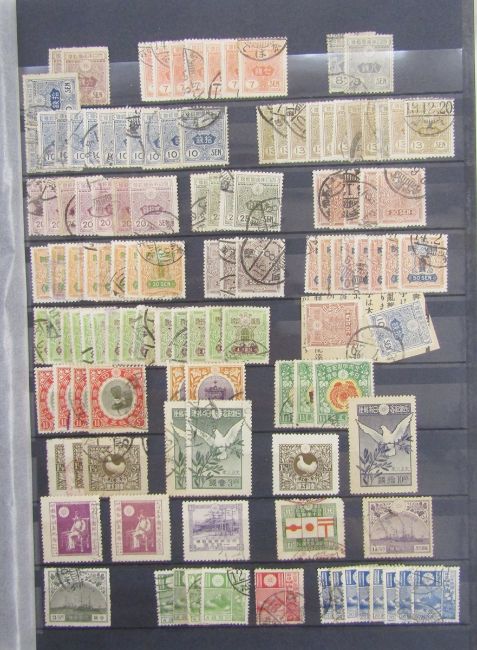 Stamps of Japan: Four A4 stock-books full of mint and used from 1870s to late 20thC plus empty bespoke Lindner album for 1981-87 issues. Definitives, commemoratives, air with some national park & Ryukyus Island plus booklets, sheetlets, many mini-sheets and higher cat values amongst this large accumulation of 1000s. Postmark interest includes botas and special-to-event (x5)