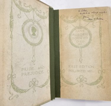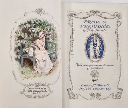 Austen, Jane "Pride and Prejudice", J M Dent & Co 1907, illustrated by C E Brock from 'The Series of English Idylls', inked inscription on ffep, has been rebacked, the original gilt decorated cloth laid down and another copy, Daily Express Publications 1933 (2)