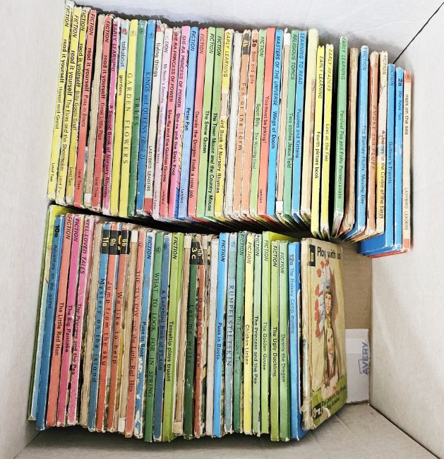Quantity of vintage Ladybird book titles - to include "Smoke and Fluff", " A Journey to the Centre of the Earth", "The Sly Fox and the Little Red Hen", " Talk About Gardens",  "Trees", etc. condition varies  (1 box)