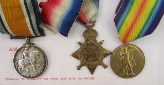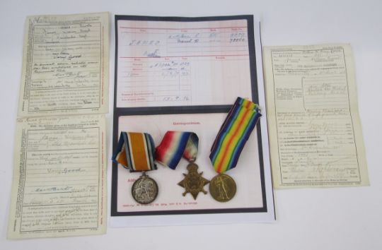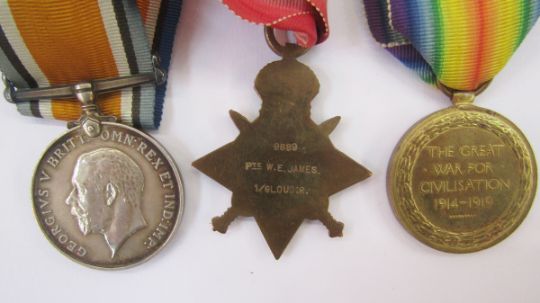 WWI 1914 Star, War Medal and Victory Medal named to "9889 PTE.W.E JAMES.1/GLOUC.R", original discharge and character certificates, large framed photograph of soldier from the Gloucestershire Regiment, William Ernest James enlisted in the Gloucestershire Regiment 3/12/1913, he also served in the Manchester Regiment