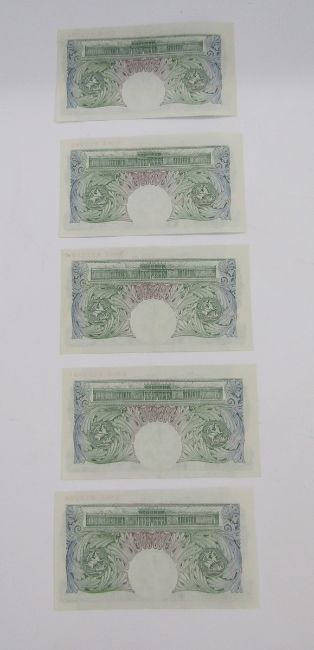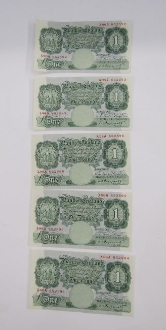 5 x Bank of England one pound notes (1) signed K O Peppiatt Prefix, prefix X98A 652592 to 65296,(BE52b), generally very fine, note ending 95, slight crease in top right corner