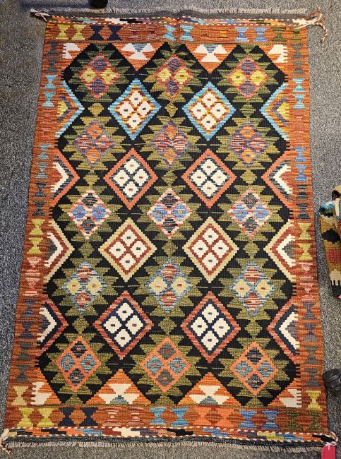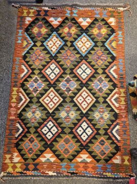 Maimana Kilim black ground rug with two rows of four lozenges and three rows of five hooked lozenges, single geometric border 160cm x 105cm