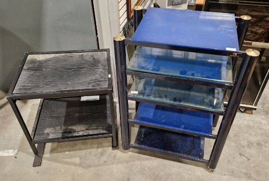 Soundstyle hifi stand comprising five glass shelves (two clear, five blue), 59cm wide x 38cm deep x 82cm high and another stand, 51cm wide x 41cm deep x 53cm high