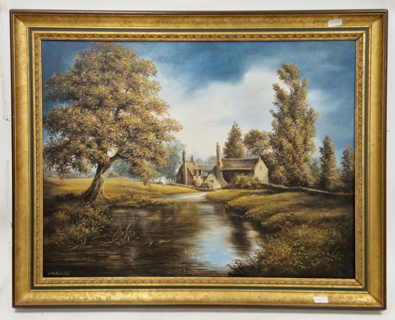 John Heathcote Hunt (20th century) Oil on canvas "Coln St Aldwyn", view of river with buildings beyond, signed lower left, framed, 66cm x 87cm