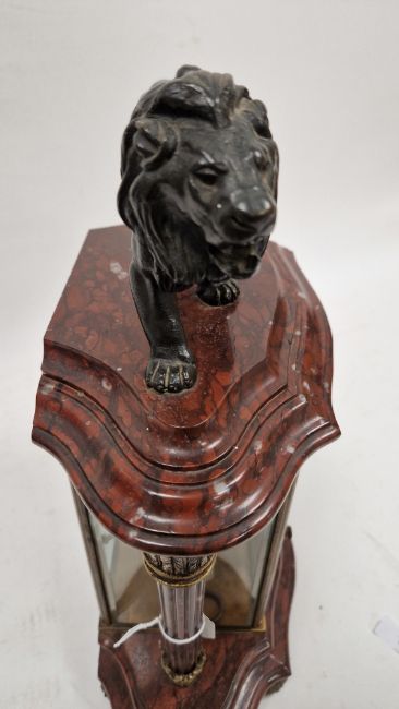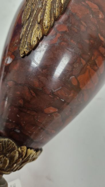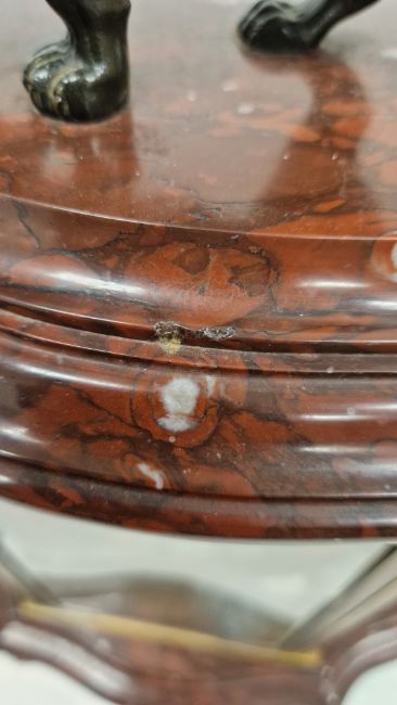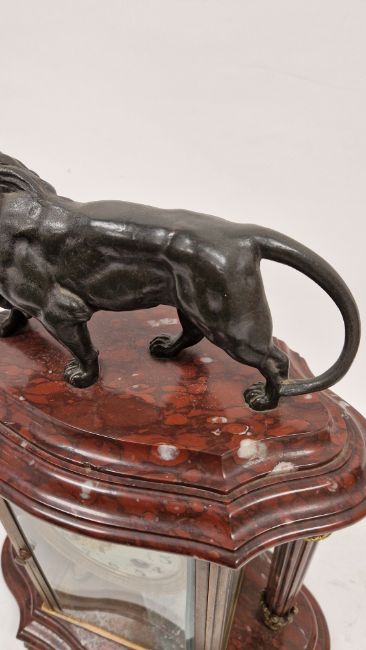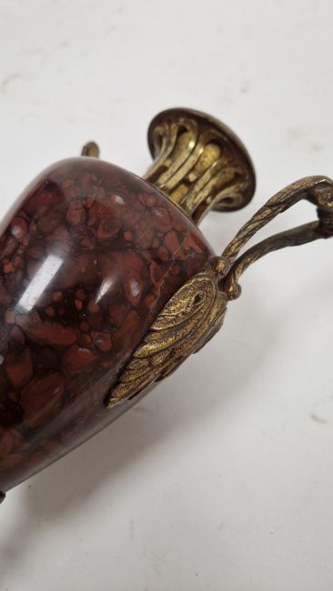 Light surface marks, accretions, small chip to underside edge of base on one garniture, a couple of small chips to the marble on the clock, general wear and tear.
