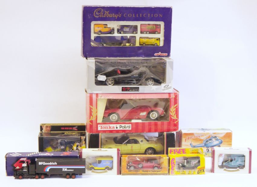 Quantity of Corgi, Matchbox, Oxford and other diecast models to include UT models UT0597 Chevrolet, Maisto Thunderbird Show Car, Tonka Polistil Ferrari California, Matchbox 2 X Y-12, Y-20, Y-3, Corgi 007 You Only Live Twice 04601 Gyrocopter, Louis Marx & Co HK-6247 Friction Helicopter, etc
