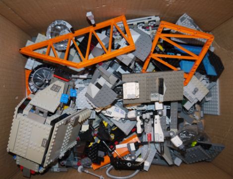 Four boxes of loose Lego to include part built No.6208 B-wing Fighter, No.9493 X-wing Starfighter (near complete) and No.7965 Millennium Falcon (mostly incomplete) as well as other part sets (4) (PLEASE NOTE VAT WILL BE PAYABLE ON THE HAMMER PRICE)