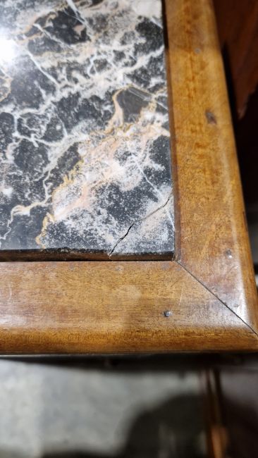 Both with surface scratches, scuffs and knocks. Fading/discolouration. One with old worm and worm (treated), the second is missing back board section, crack to corner of marble top, small area of old worm to drawer. General wear and tear.