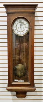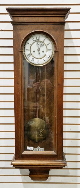 19th century walnut cased Vienna-style eight-day hanging wall clock, the glazed door opening to a gilt and white enamel dial, having roman numerals and marked GB with anchor and crown, with pendulum and two weights, 108cm high