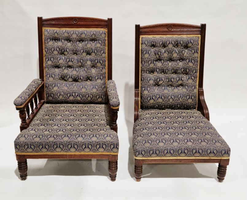 Edwardian matching 'His and Hers' parlour chairs, each with a top rail carved with a patera and foliage, blue and gold buttonback upholstery and turned ring legs, largest 100cm high x 68cm wide x 70cm deep