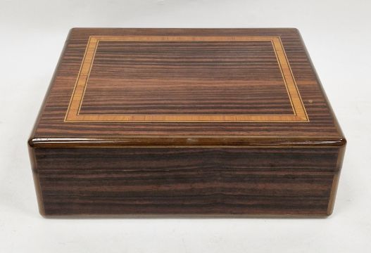 Some slight surface scratching to the veneered box, there is some slight flaking to the varnish/some small drips which have caused some surface flaking to varnish, the hygrometre has some wear and deterioration to gilt metal surface at the edges (it may not be functioning), the cigar cutter action is functioning, leather pouch is ok.