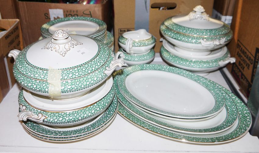 Reliable England Pebbles dinner service to include tureens, dinner plates, serving plates, etc, a Royal Worcester gold lustre part dinner service and a collection of glassware (2 boxes plus)