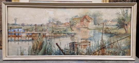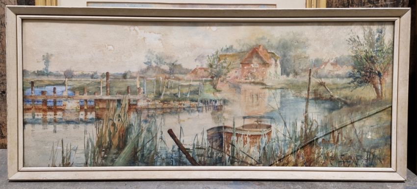 Three early 20th century school watercolours, the first depicting a house before a bridge with boat amongst reeds, indistinctly signed 'Maurice Haud...', indistinctly dated (glazing cracked), 28.5cm x 73cm excluding frame, another by A R Perrin depicting wheatsheaves in landscape, signed lower right, the third unsigned showing figures on a bridge in river landscape (3)