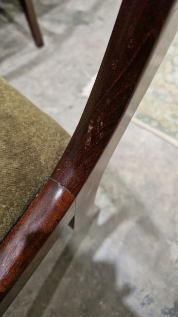 Surface scratches, scuffs and knocks, some fading/discolouration. Joint on some are seperating and loose. Minor repair to one joint. Small split to one back rest support, small repair to back of backrest on one chair. General wear and tear.