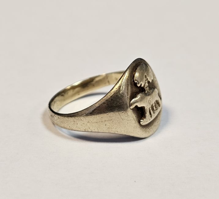 Yellow metal signet ring (tests as gold) with relief crest of an elephant under a tree, size S 1/2, approximate weight 6.1 grams