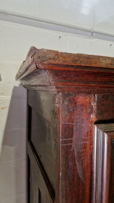 19th century continental walnut cupboard, the moulded cornice over panelled sides and a single moulded panel door with drawer below, on large squat bun feet to front (with key), 194cm high x 119cm wide x 70cm deep  Condition Report Surface scratches, scuffs and knocks. Numerous areas of old worm, splits and areas of loss, repair to bottom hinge, moulded section bottom right side detached but present. No interior shelving, key present. General wear and tear.