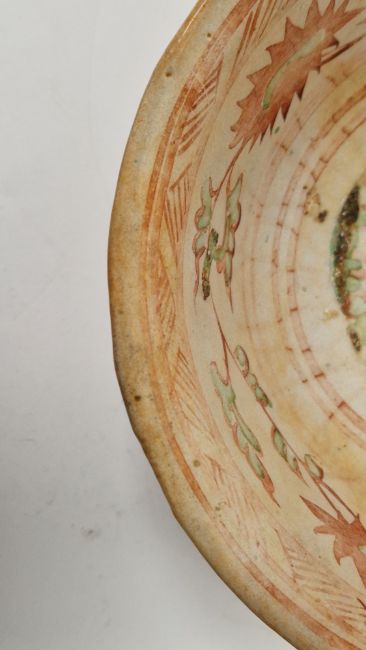 Surface scratches, accretions, wear to decoration, pinholes to glaze. Indentations and small areas of missing glaze from manufacturing process. Fused pottery and glaze around centre of bowl. Appears to be a crack to outer surface but doesn't show on opposite side so probably just a deeper scratch. General wear and tear.