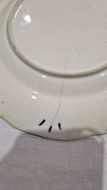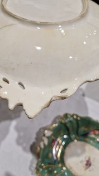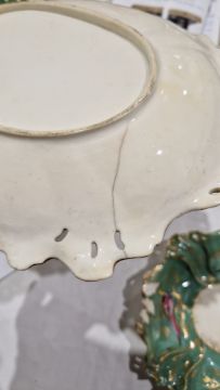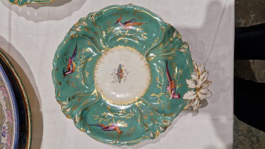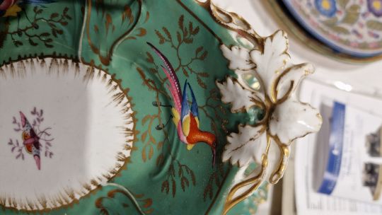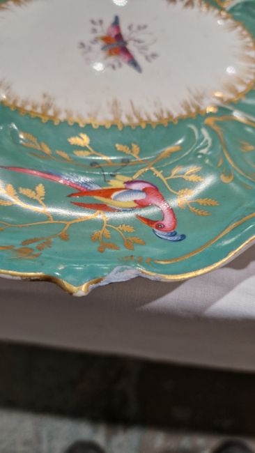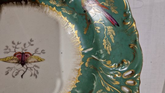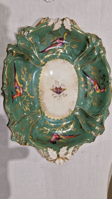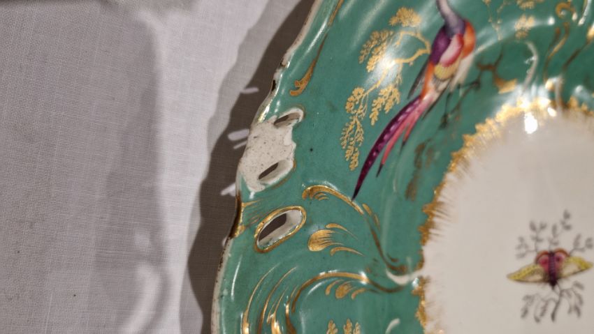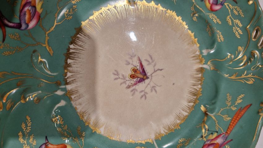 Coalport green ground dessert service, circa 1835, incised X marks, printed and painted with exotic birds perched on gilt leafy branches, the centres with moths and butterflies within scroll pierced foliate borders, comprising a large oval pierced footed centrepiece, 25cm high (cracked), two oval two-handled sauce tureens, covers and stands, four shaped oval dishes with pierced foliate handles, three shaped rectangular dishes with pierced foliate handles, four shaped circular dishes with foliate handles, 23 plates  Condition Report All pieces with surface marks, varying degrees of wear and crazing. Plates - 23cm diameter, Surface marks, staining/discolouration, hairline to 7 plates, old repair to one, chip to edge of two plates.Handled plates - Surface marks, staining/discolouration, hairline to one and chip to underside edge of one.Oval dishes - discolouration/staining, chips to edges, hairline to one.Serving dishes - chips to edges, areas of loss to handles, old repair to one. Lidded tureen - chip to handleCentrepiece bowl - hairline to bowl, pedestal with large crackGeneral wear and tear.